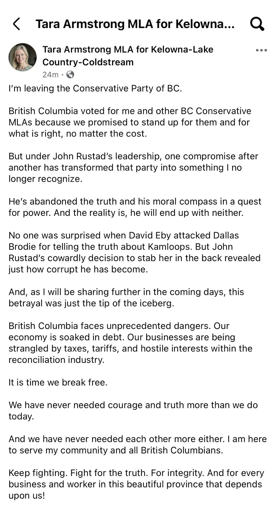 Then Tara Armstrong, MLA for Kelowna-Lake Country-Coldstream, left the BC Conservatives. In her social media post, she states "it is time to break free." She writes, "no one was surprised when David Eby attacked Dallas Brodie for telling the truth about Kamloops. But John Rustad's cowardly decision to stab her in the back revealed just how corrupt he has become."