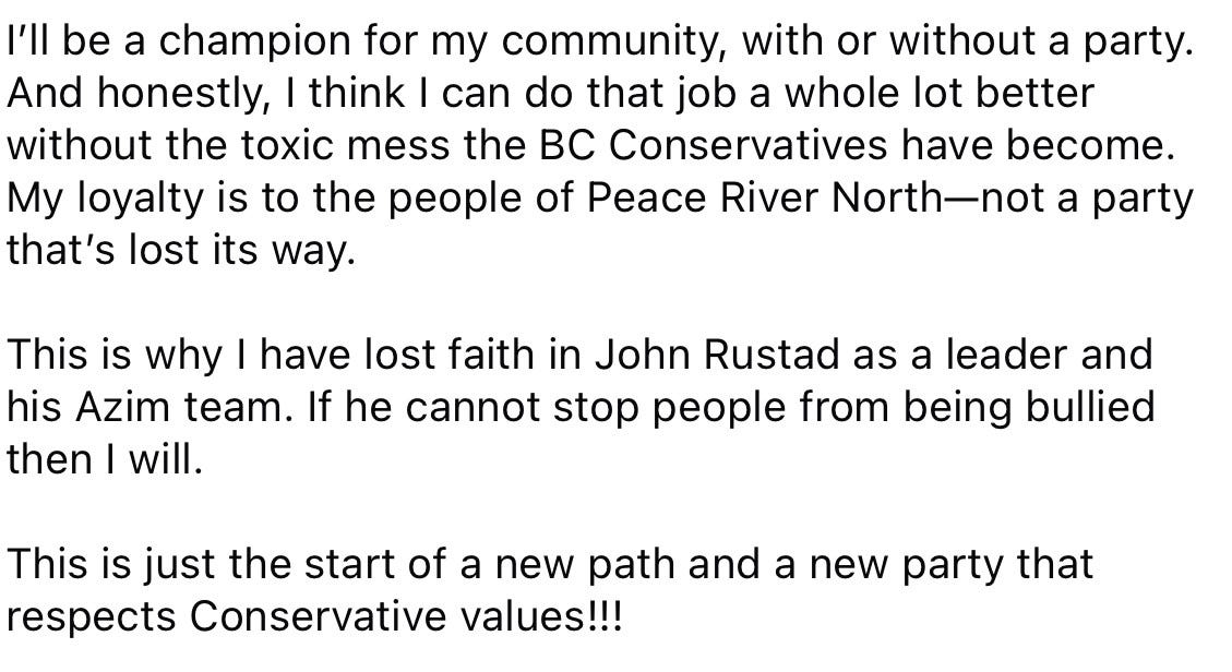 As it turns out, Brodie wasn't the only member of the BC Conservatives who had a problem with Rustad's decision.