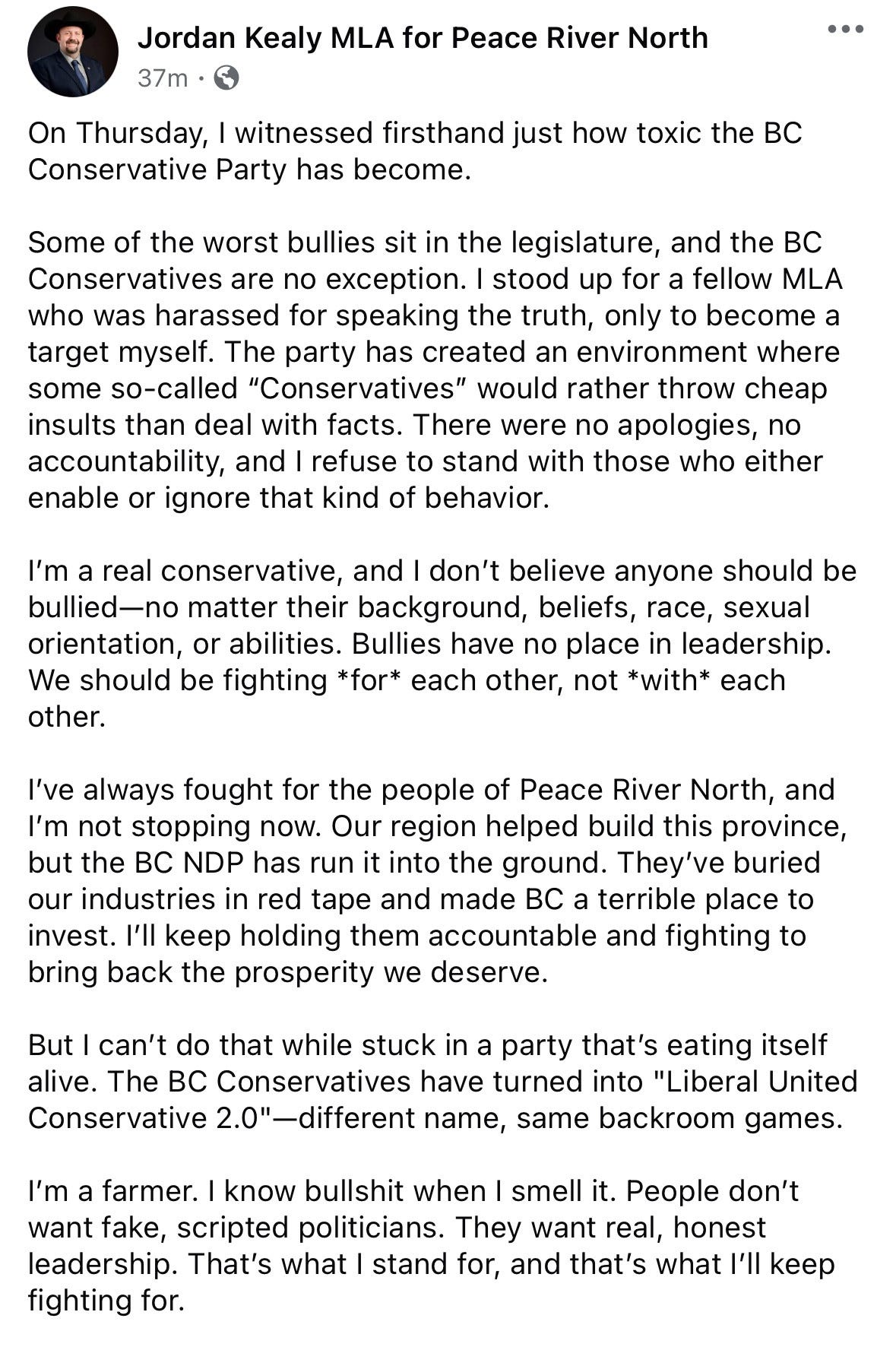 Hours after Brodie was fired, Jordan Kealy, MLA for Peace River North, announced he was also leaving the BC Conservatives and going to start his own party. In his post to social media, Kealy is clearly most frustrated with "bullies" and how the party has become a home where "so-called 'Conservatives' would rather throw cheap insults than deal with facts."
