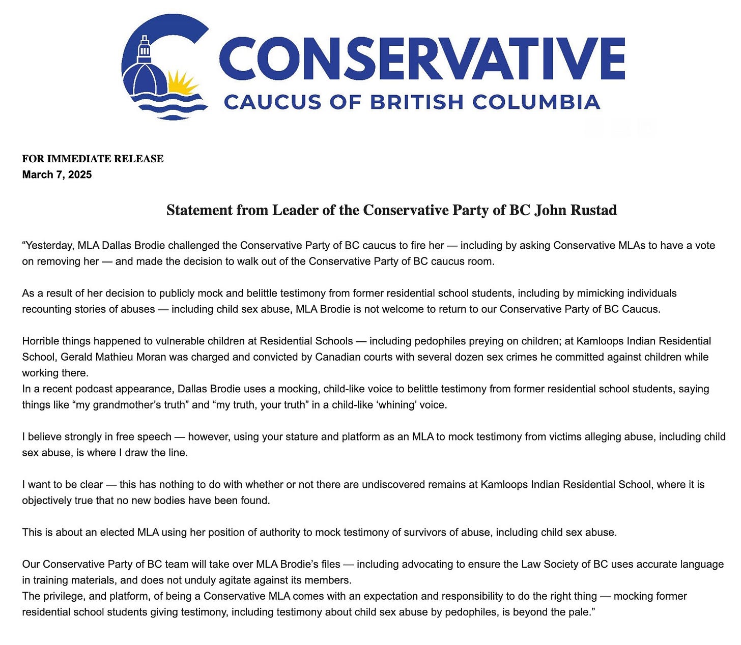 Rustad made the right decision to remove Vancouver-Quilchena MLA Dallas Brodie from the BC Conservative caucus for her ignorantly and grotesquely mocking residential school survivors recounting their testimony of abuse "in a child-like 'whining' voice". It is the total failure of Rustad to establish moral boundaries that has led to this implosion.